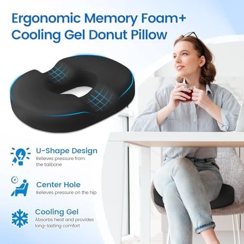 [Donut Shape for Pressure Relief]: The U-shaped and center hole design of the memory foam & cooling gel donut pillow seat cushion helps to relieve pressure on the hips and provide long lasting comfort