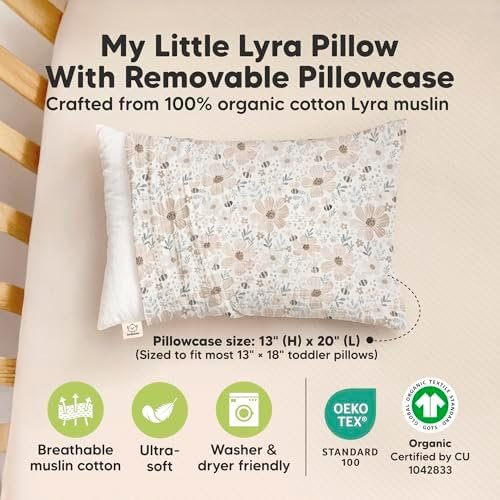 Ultra-Soft Lyra Muslin Pillow Case – Comes with a removable organic cotton muslin pillowcase that meets OEKO-TEX 100 Standard and GOTS Certified (CU 1042833), this highly breathable toddler pillow for sleeping stays cool and comfy all year-round.