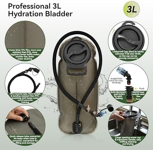 Professional 3L Hydration Bladder: Made of 100% BPA free, tasteless TPU. Quick release valve allows you to refill water without connecting hose. Large opening is easy to clean and add ice cube. 360 degrees rotatable mouthpiece allows for easy drinking. Shut On/Off valve helps to adjust water flow. Middle baffle keeps the bladder flat and makes it easier to place into the backpack.