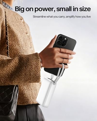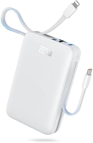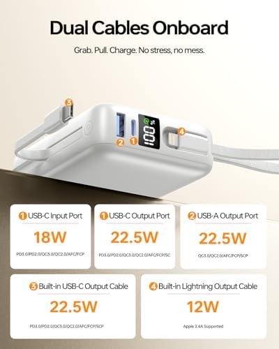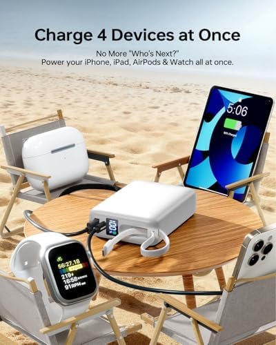 CHARGE UP TO 4 DEVICES SIMULTANEOUSLY: The power bank features 1 USB-C input/output port, 1 built-in USB-C output cable, 1 USB-A output port, and a built-in Lightning output cable, allowing you to charge up to 4 devices at the same time. The powerbank is suitable for most electronic devices such as mobile phones, headphones, tablets, etc., making it easy for you to share with friends and family.