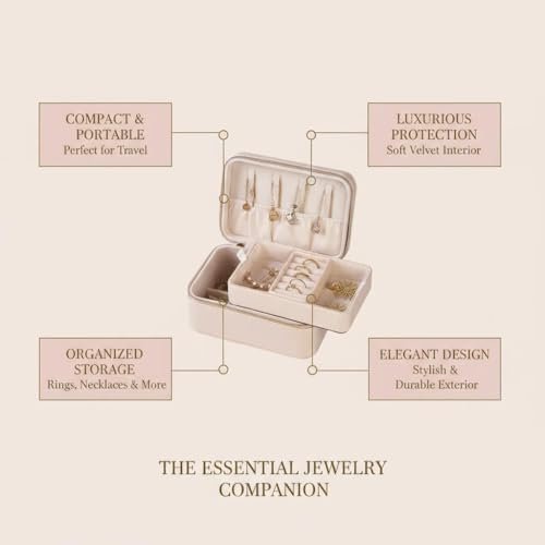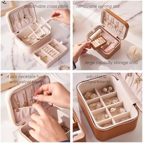 SMALL JEWELRY TRAVEL CASE: This jewelry organizer (6.0 x 4.1 x 2.8 inches) can easily fit into your luggage or handbag. Dual-layer design with 4 velvet necklace hooks and 1 heightened storage pocket on the top, 1 tier for rings/earrings/pins/lip sticks, 2 tiers for bracelets/brooches/bracelets, 8 removable compartments on the bottom to ensure that your jewelry is categorized and stored.