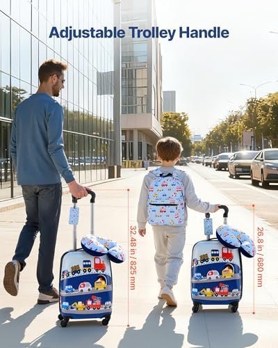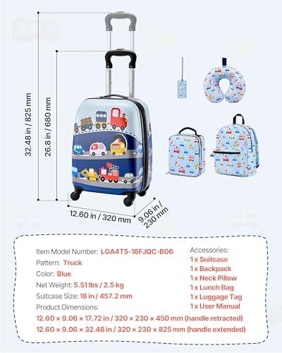 Airline-Approved 5-Piece Set: This 18 inches toddler suitcase and matching accessories meet airline cabin standards, ideal for solo travel. It includes a backpack, pillow, lunch bag, and luggage tag