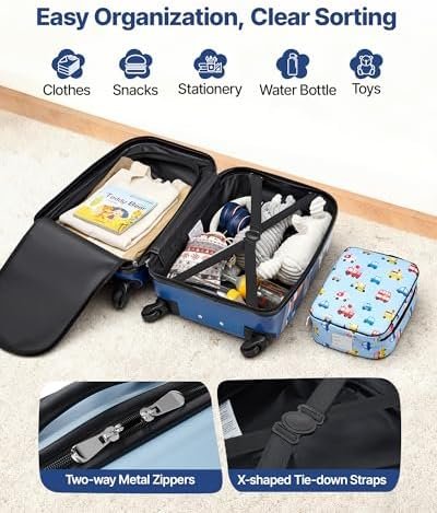 Convenient Storage: Smooth double-way zipper and roomy interior for easy organization. Separate compartments of the child rolling suitcase for clothes, snacks, and school supplies—plus a lunch bag for added convenience